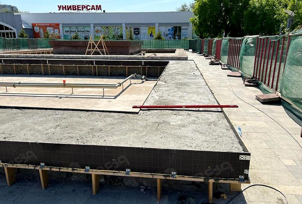 Сегодня на площади Танича в 18 микрорайоне начались работы по заливке бетона на бортах чаши фонтана.