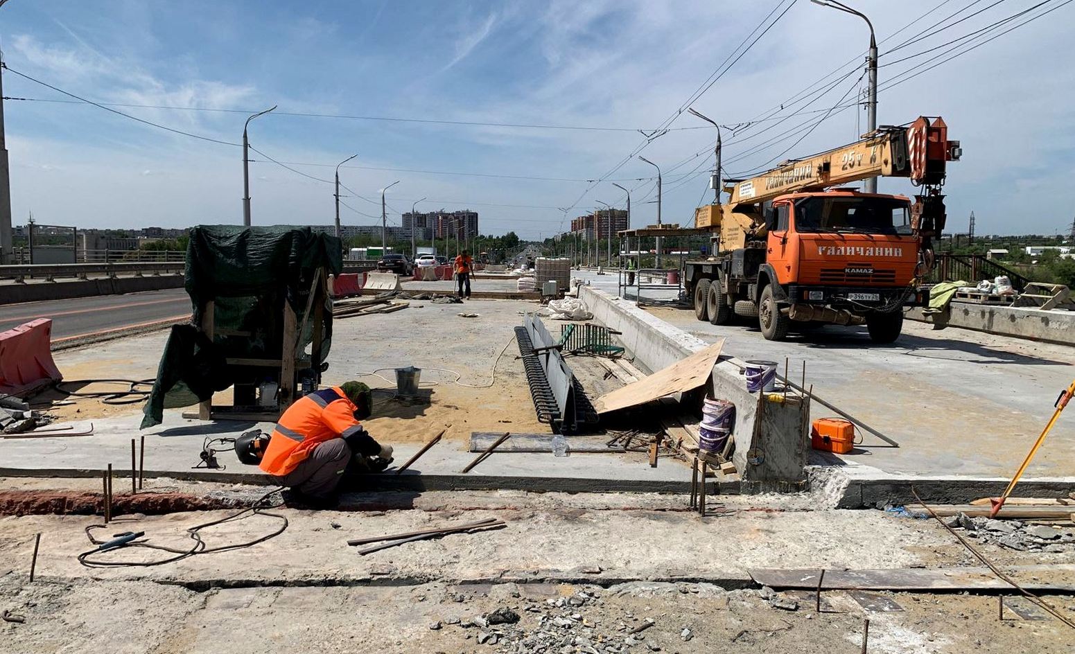 Подрядчики завершают бетонирование выравнивающего слоя дороги на участке, где расположено трамвайное полотно. Напомним, что перед началом ремонтных работ старые трамвайные пути были демонтированы. Бетонирование дороги планируется завершить на этой неделе. В настоящее время дорожники ведут также работы в зоне сопряжения дороги и моста на участке в направлении от промзоны к городу. На путепроводе начались работы по устройству гидроизоляции дорожного покрытия моста. На 50% выполнена также гидроизоляция пешеходных зон. В ближайшее время на объекте начнется бетонирование железобетонного цоколя, который разделяет трамвайное полотно и проезжую часть дороги.