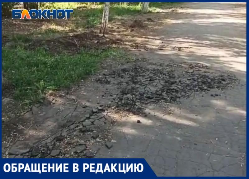 В редакцию «Блокнот Волжский» 2 октября обратился местный житель, который проживает в старой части город. Мужчина регулярно бывает на аллее по улице Комсомольской. После работ по выкорчевыванию старых деревьев, он обнаружил неприятный сюрприз — все дорожки здесь разбили и оставили в плачевном состоянии.