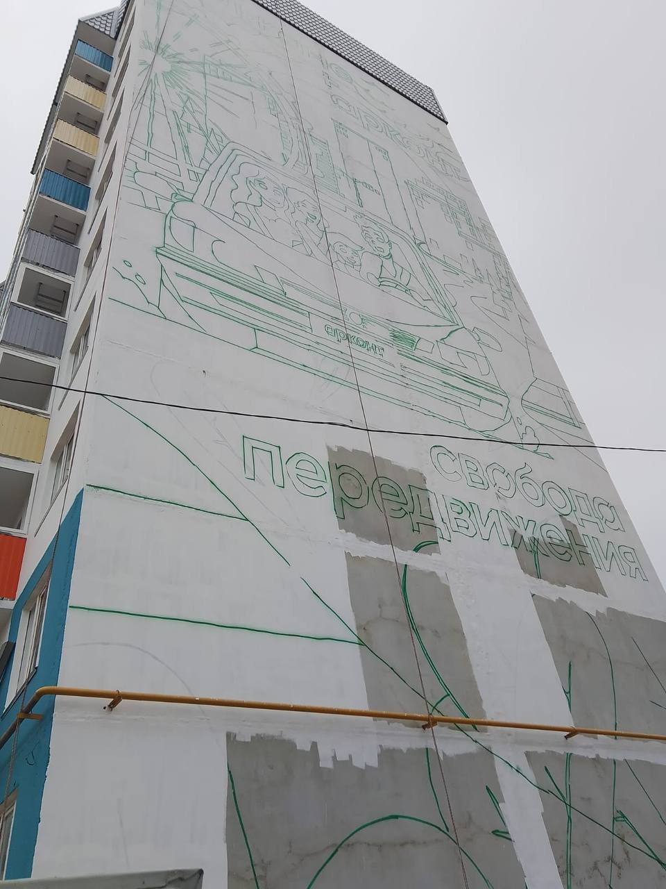 Новый мурал на фасаде девятиэтажного панельного дома должен появиться в конце ноября. На монументальном рисунке будет изображена семья, путешествующая на автомобиле по городам России. На данный момент рабочие нанесли на фасад здания разметку с помощью проектора, покрыли стену грунтовой краской, подобрали цвета, необходимые для рисунка.