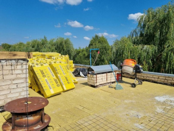 В настоящее время активная работа идёт на крыше здания. По всему периметру
