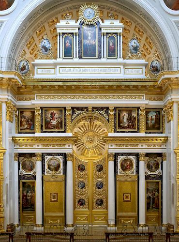 дерево, металл или камень.Обычно в иконостас встроены три двери, по одной с каждой стороны (дьяконские двери) и одна в центре (Святая дверь или Царская дверь), и каждый проем также имеет завесу, закрывающую обзор, даже если двери открыты. Иконостасы украшены иконами важных деятелей христианства (частью определения иконописного искусства является то, что изображения носят религиозный характер), которые расположены восходящими рядами, с наиболее важными и выдающимися иконами внизу, на флангах.