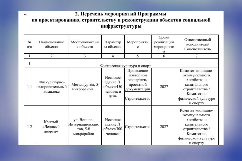 В программе сообщается о том, что строительство физкультурно-оздоровительного комплекса (ул. Металлургов, 5 микрорайон) позволит увеличить количество мест для занятий физической культурой и спортом на 450 человек в день и более качественно проводить физкультурно-оздоровительные и спортивно-массовые мероприятия среди населения, а также привлечет проведение официальных соревнований различного уровня.