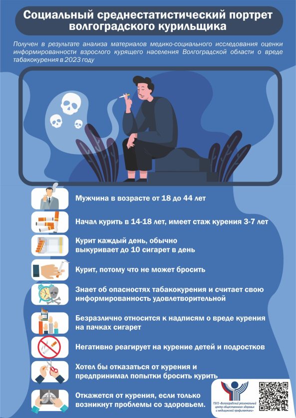 Благодаря проведённому опросу удалось составить «портрет» волгоградского курильщика. Это мужчина в возрасте от 18 до 44 лет, который курит каждый день, а начал курить в 14-18 лет, имеет стаж курения 3-7 лет, обычно выкуривает до 10 сигарет в день, курит, потому что не может бросить, знает об опасностях табакокурения и считает свою информированность удовлетворительной, безразлично относится к надписям о вреде курения на пачках сигарет, негативно реагирует на курение детей, хотел бы отказаться от курения и предпринимал попытки бросить курить, знает, что в поликлинике по месту жительства может получить бесплатную помощь в отказе от курения, он откажется от курения, если возникнут проблемы со здоровьем.