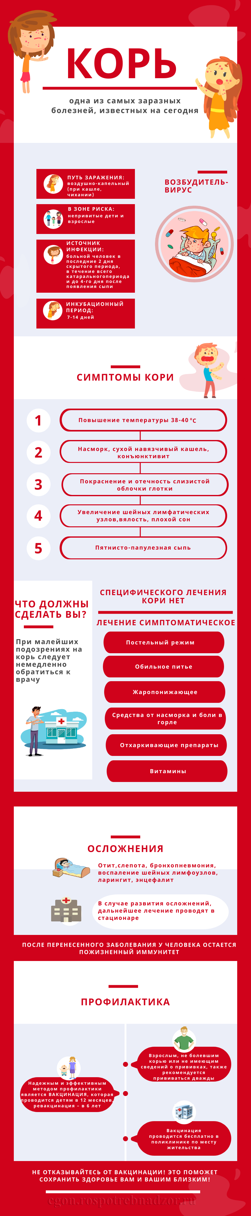 Все члены семьи должны принимать витамины, особенно А и С. Если в семье есть не болевший и не вакцинированный ребенок, то ему нельзя посещать детский коллектив с 8 до 17 дня от контакта с больным.Вовремя начатое лечение кори убережет вас от опасных осложнений!