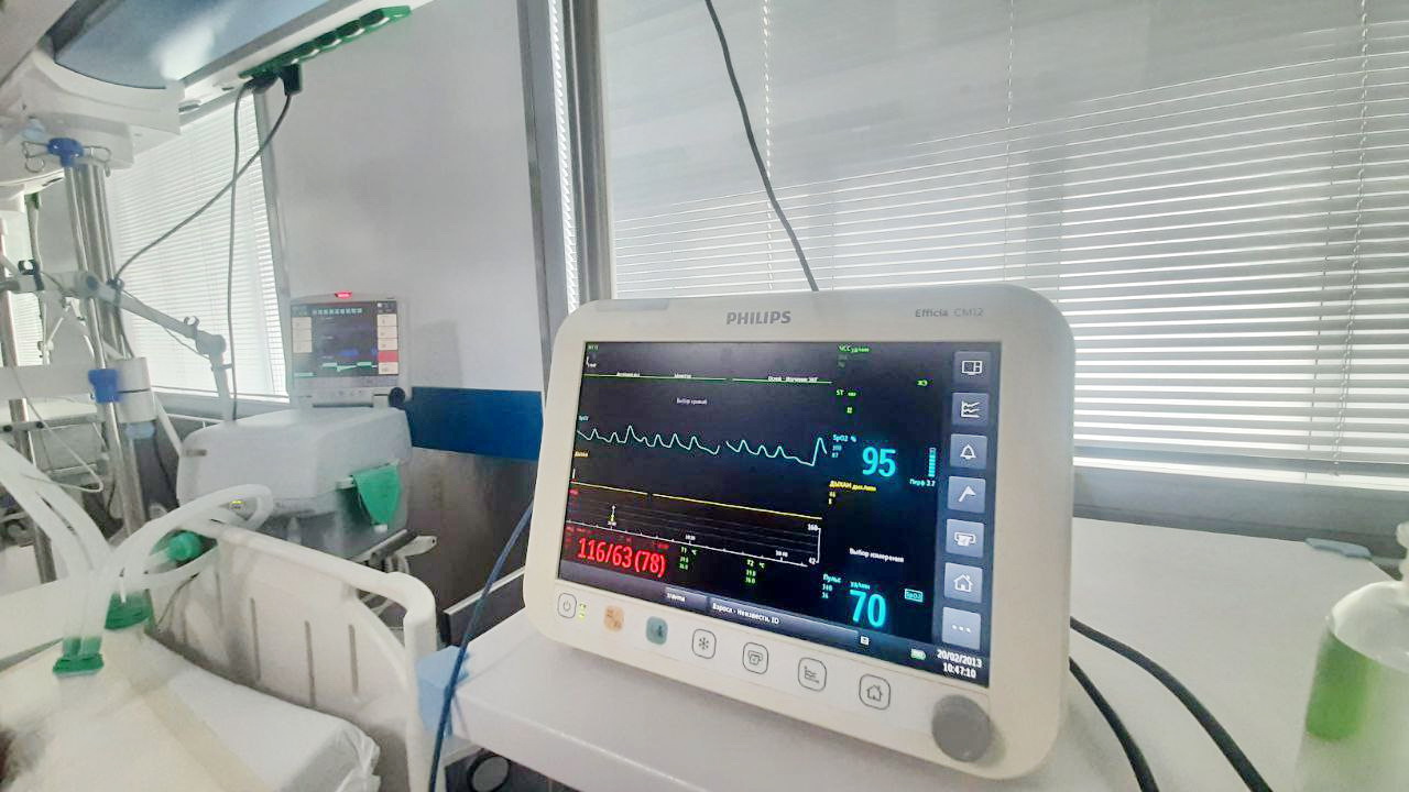 Рядом с каждым местом смонтирован аппарат искусственной вентиляции легких и монитором для измерения насыщения крови кислородом, артериального давления, частоты дыхания, температуры, концентрации выдыхаемого углекислого газа. Здесь же можно снять электрокардиограмму, все необходимые приборы — в наличии.